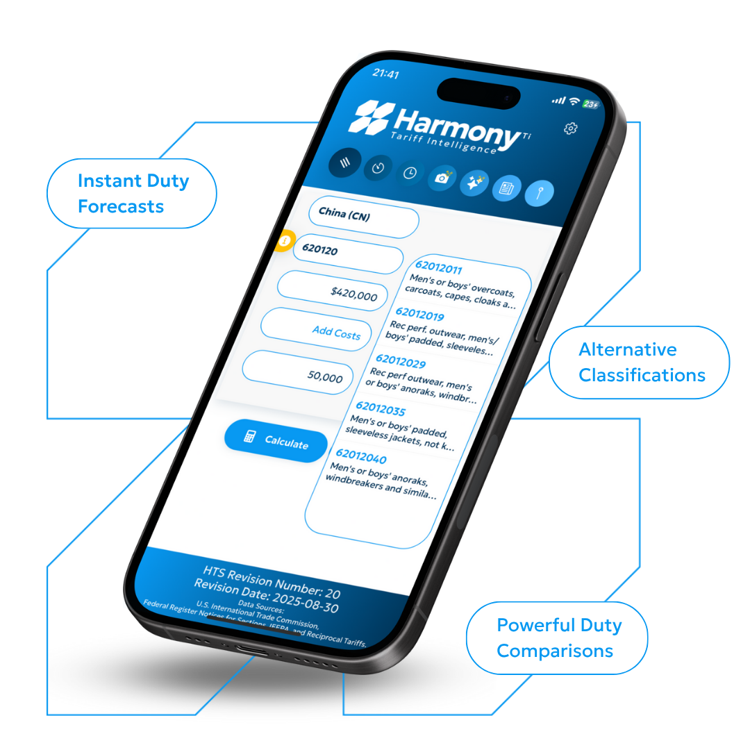 Seize clarity on every shipment! Download HarmonyTi today to forecast duties in seconds, catch costly misclassifications, and start saving today with AI-driven precision.